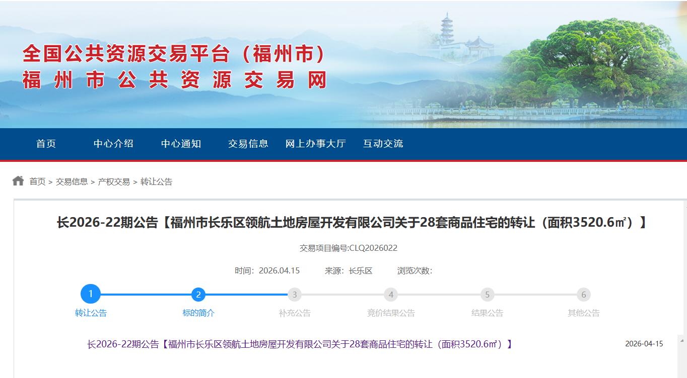 2026年4月15日,福建省金盛拍卖有限公司发布“长2026-22期公告【福州市长乐区领航土地房屋开发有限公司关于28套商品住宅的转让(面积3520.6㎡)】”。
