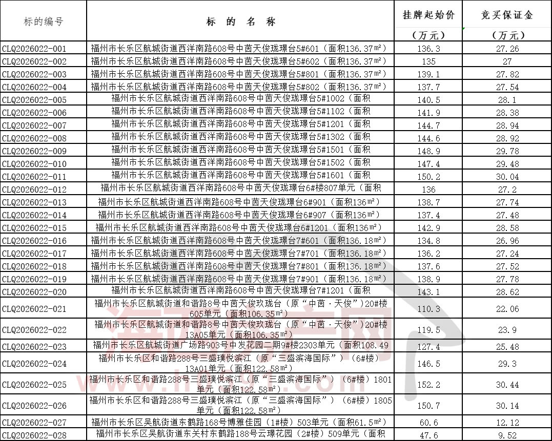 经福州市长乐区人民政府专题会议纪要(﹝2025﹞165号)批准,受福州市长乐区领航土地房屋开发有限公司委托,我公司定于2026年5月6日10:00在福州市长乐区文武砂街道湖文路201号福州新区政务服务中心4层大拍卖间公开竞价交易坐落于福州市长乐区共28套市场化商品房。