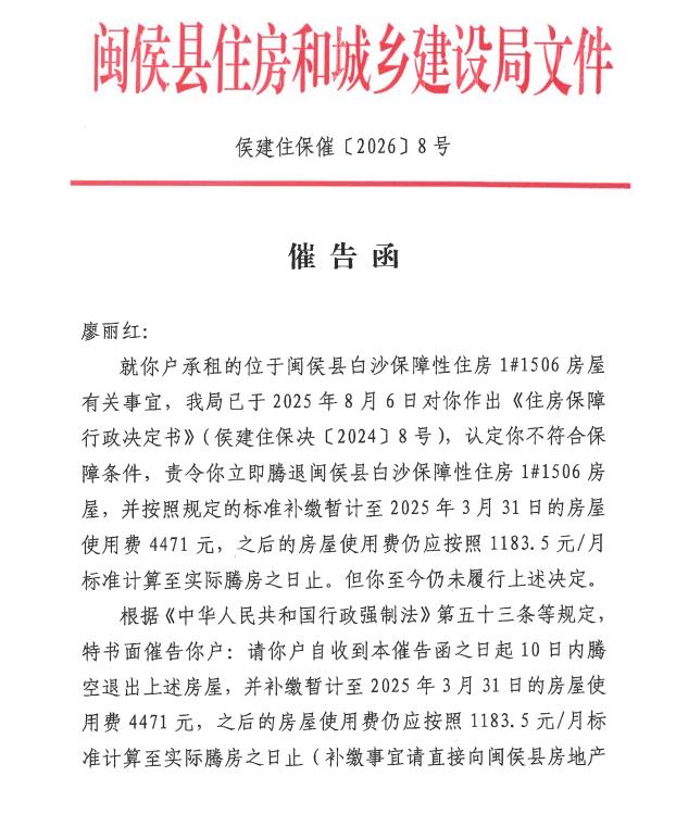 就你户承租的位于闽侯县白沙保障性住房1#1506房屋有关事宜,我局已于2025年8月6日对你作出《住房保障行政决定书》(侯建住保决[2024]8号),认定你不符合保障条件,责令你立即腾退闽侯县白沙保障性住房1#1506房屋,并按照规定的标准补缴暂计至2025年3月31日的房屋使用费4471元,之后的房屋使用费仍应按照1183.5元/月标准计算至实际腾房之日止。但你至今仍未履行上述决定。根据《中华人民共和国行政强制法》第五十三条等规定,特书面催告你户:请你户自收到本催告函之日起10日内腾空退出上述房屋,并补缴暂计至2025年3月31日的房屋使用费4471元,之后的房屋使用费仍应按照1183.5元/月标准计算至实际腾房之日止(补缴事宜请直接向闽侯县房地产开发公司缴纳)。