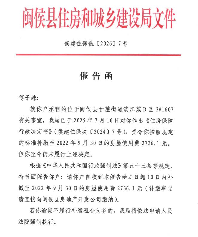 就你户承租的位于闽侯县甘蔗街道滨江苑B区3#1607有关事宜,我局已于2025年7月10日对你作出《住房保障行政决定书》(侯建住保决[2024]7号),责令你按照规定的标准补缴至2022年9月30日的房屋使用费2736.1元。但你至今仍未履行上述决定。