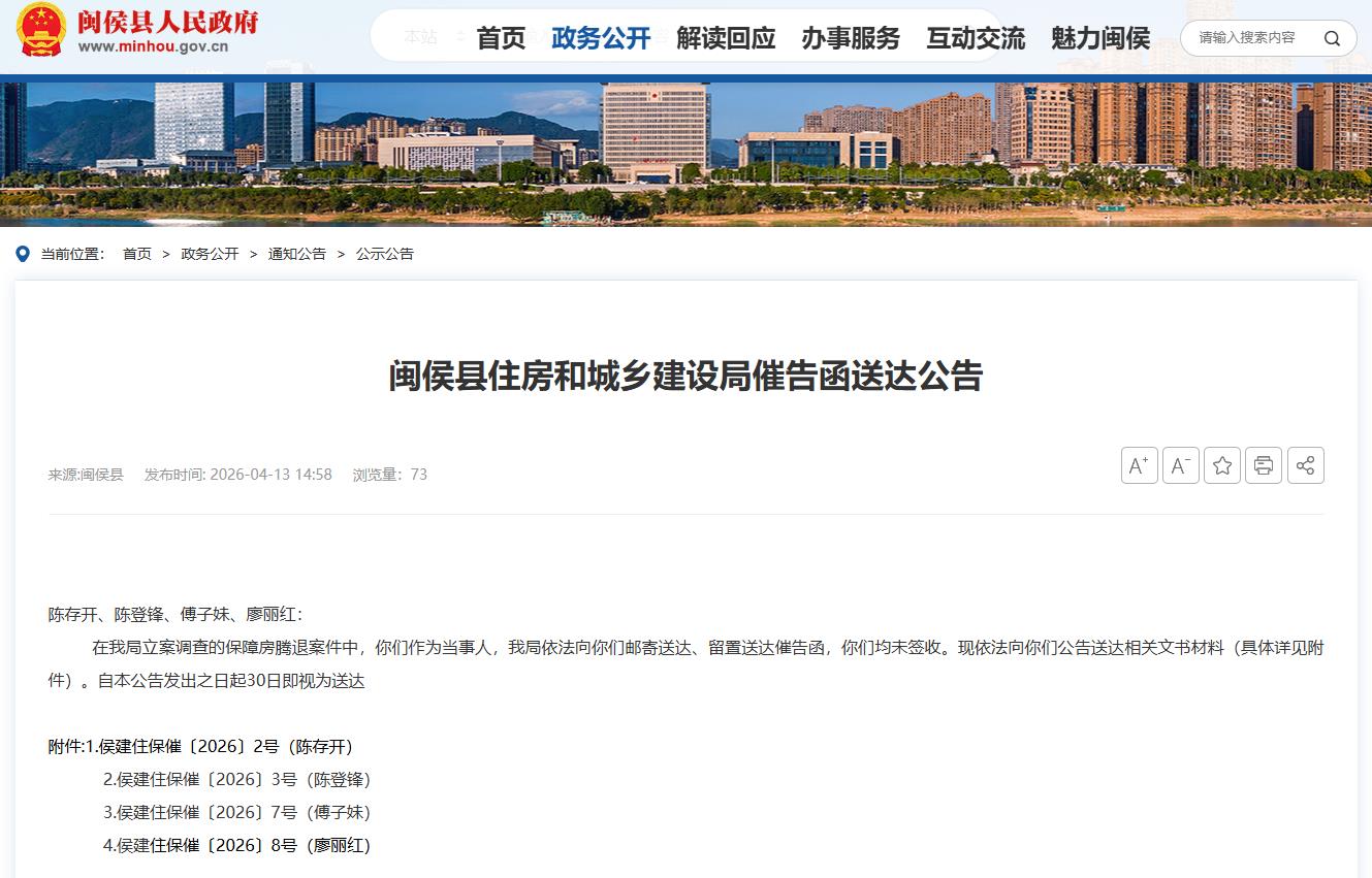 公告显示,在我局立案调查的保障房腾退案件中,陈存开、陈登锋、傅子妹、廖丽红作为当事人,我局依法向你们邮寄送达、留置送达催告函,你们均未签收。现依法向你们公告送达相关文书材料(具体详见附件)。自本公告发出之日起30日即视为送达。
