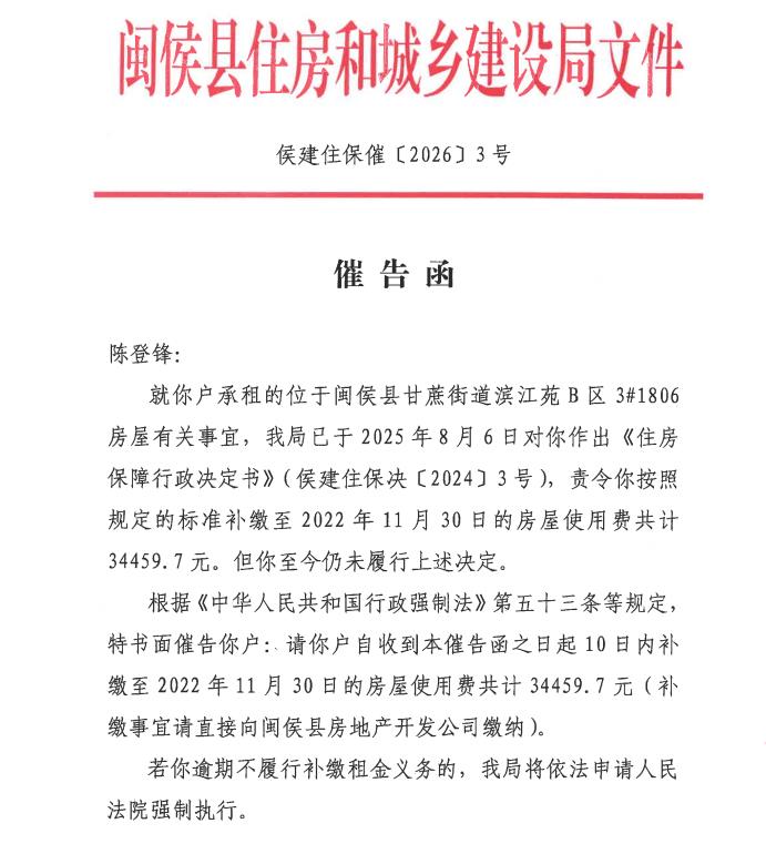 就你户承租的位于闽侯县甘蔗街道滨江苑B区3#1806房屋有关事宜,我局已于2025年8月6日对你作出《住房保障行政决定书》(侯建住保决[2024]3号),责令你按照规定的标准补缴至2022年11月30日的房屋使用费共计34459.7元。但你至今仍未履行上述决定。