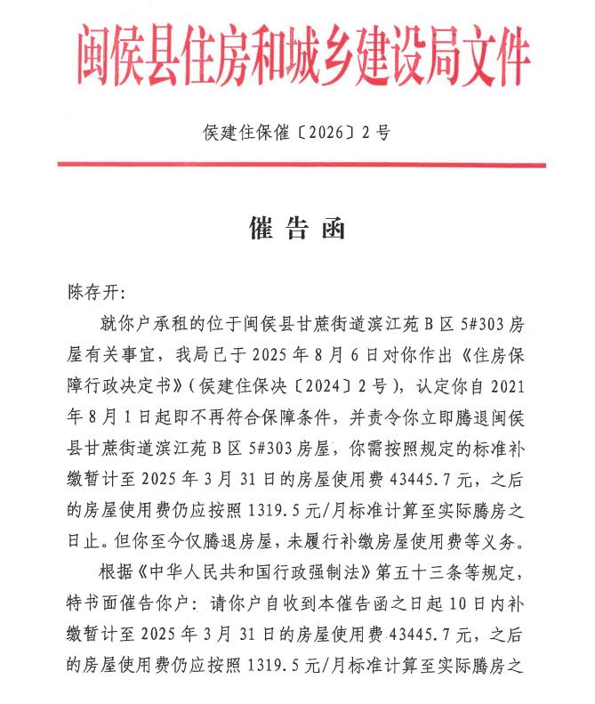 就你户承租的位于闽侯县甘蔗街道滨江苑B区5#303房屋有关事宜,我局已于2025年8月6日对你作出《住房保障行政决定书》(侯建住保决[2024]2号),认定你自2021年8月1日起即不再符合保障条件,并责令你立即腾退闽侯县甘蔗街道滨江苑B区5#303房屋,你需按照规定的标准补缴暂计至2025年3月31日的房屋使用费43445.7元,之后的房屋使用费仍应按照1319.5元/月标准计算至实际腾房之日止。