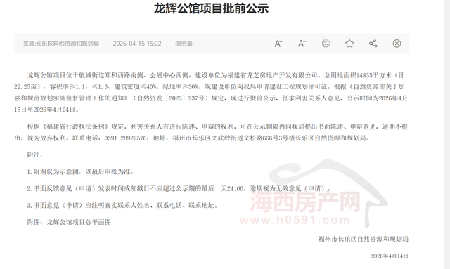 海西房产网(微信公众号:fjhxfcw)消息:4月14日,福州市长乐区自然资源和规划局发布“龙辉公馆项目批前公示”。