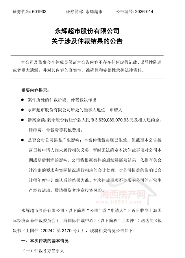 海西房产网(微信公众号:fjhxfcw)消息:4月15日,永辉超市股份有限公司发布一则“关于涉及仲裁结果的公告”。