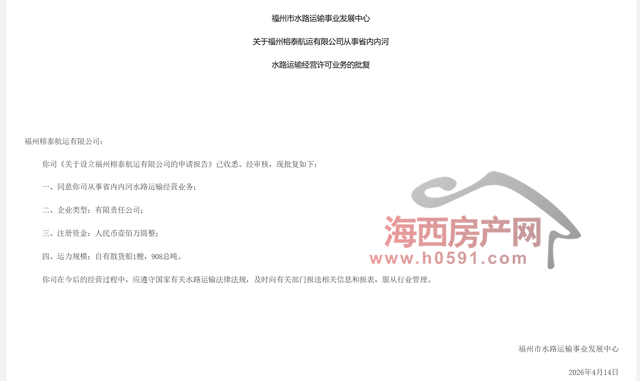 海西房产网(微信公众号:fjhxfcw)消息:4月14日,福州市水路运输事业发展中心发布“关于福州榕泰航运有限公司从事省内内河水路运输经营许可业务的批复”。