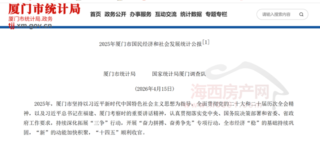 海西房产网(微信公众号:fjhxfcw)消息:4月15日,厦门市统计局、国家统计局厦门调查队联合发布“2025年厦门市国民经济和社会发展统计公报”。
