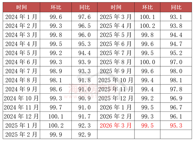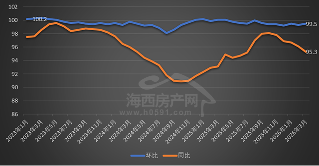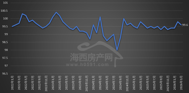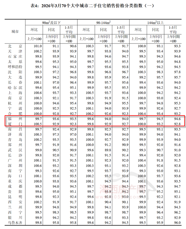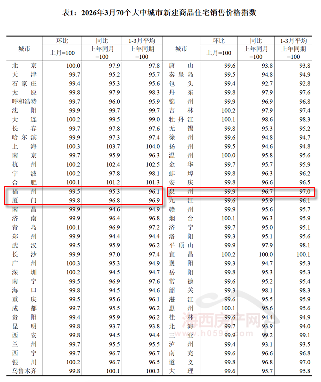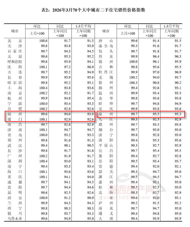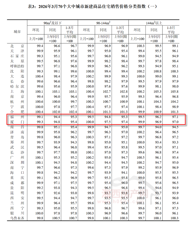 国家统计局数据显示,2026年3月福州新建商品住宅销售价格环比下跌0.5%,同比下跌4.7%;厦门环比上涨0.2%,同比下跌3.2%;泉州环比下跌0.1%,同比下跌3.3%。