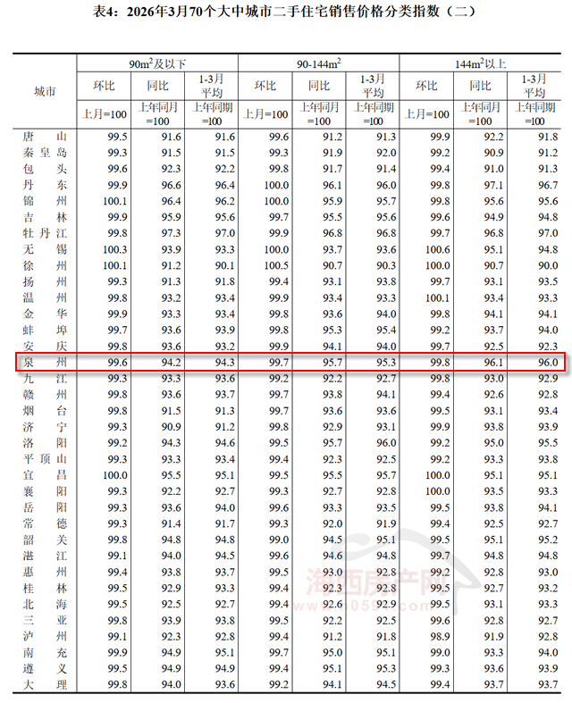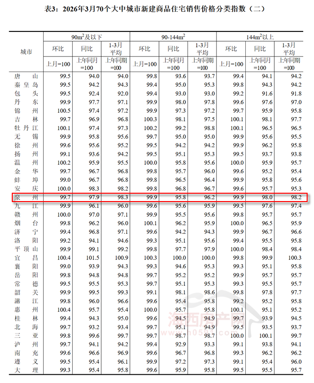 在面积段方面,3月份福州90㎡以下新建商品住宅销售价格环比下跌0.9%,同比下跌5.6%;厦门环比下跌0.7%,同比下跌5.2%;泉州环比下跌0.3%,同比下跌2.1%。