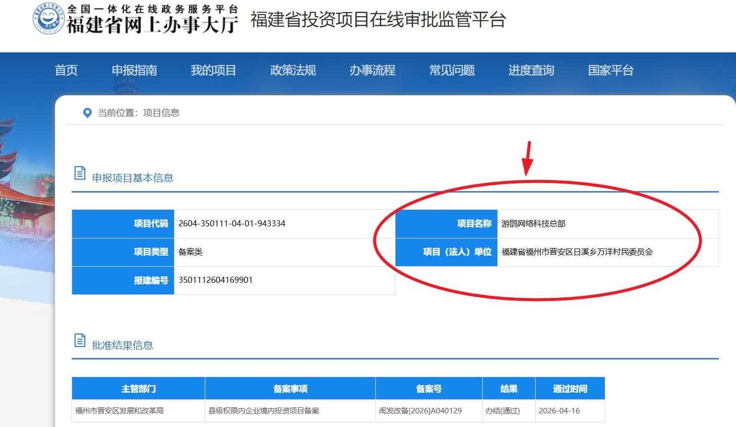 海西房产网(微信公众号:fjhxfcw)消息:福建省投资项目在线审批监管平台发布信息显示,“游鹍网络科技总部”已于2026年4月16日取得县级权限内企业境内投资项目备案,批准结果信息为办结(通过)。