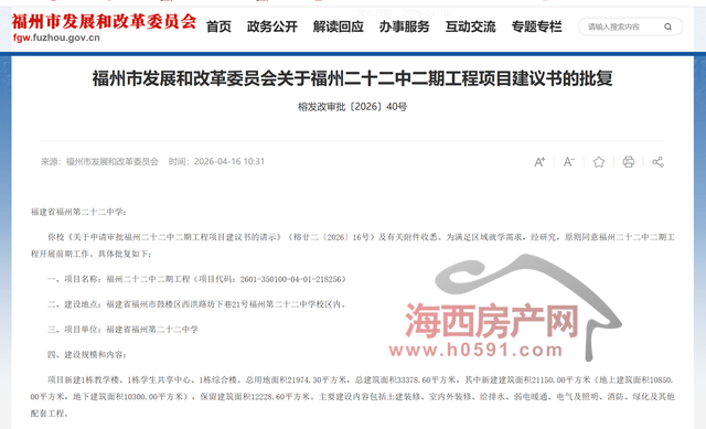 海西房产网(微信公众号:fjhxfcw)消息:4月16日,福州市发展和改革委员会发布“关于福州二十二中二期工程项目建议书的批复(榕发改审批〔2026〕40号)”。