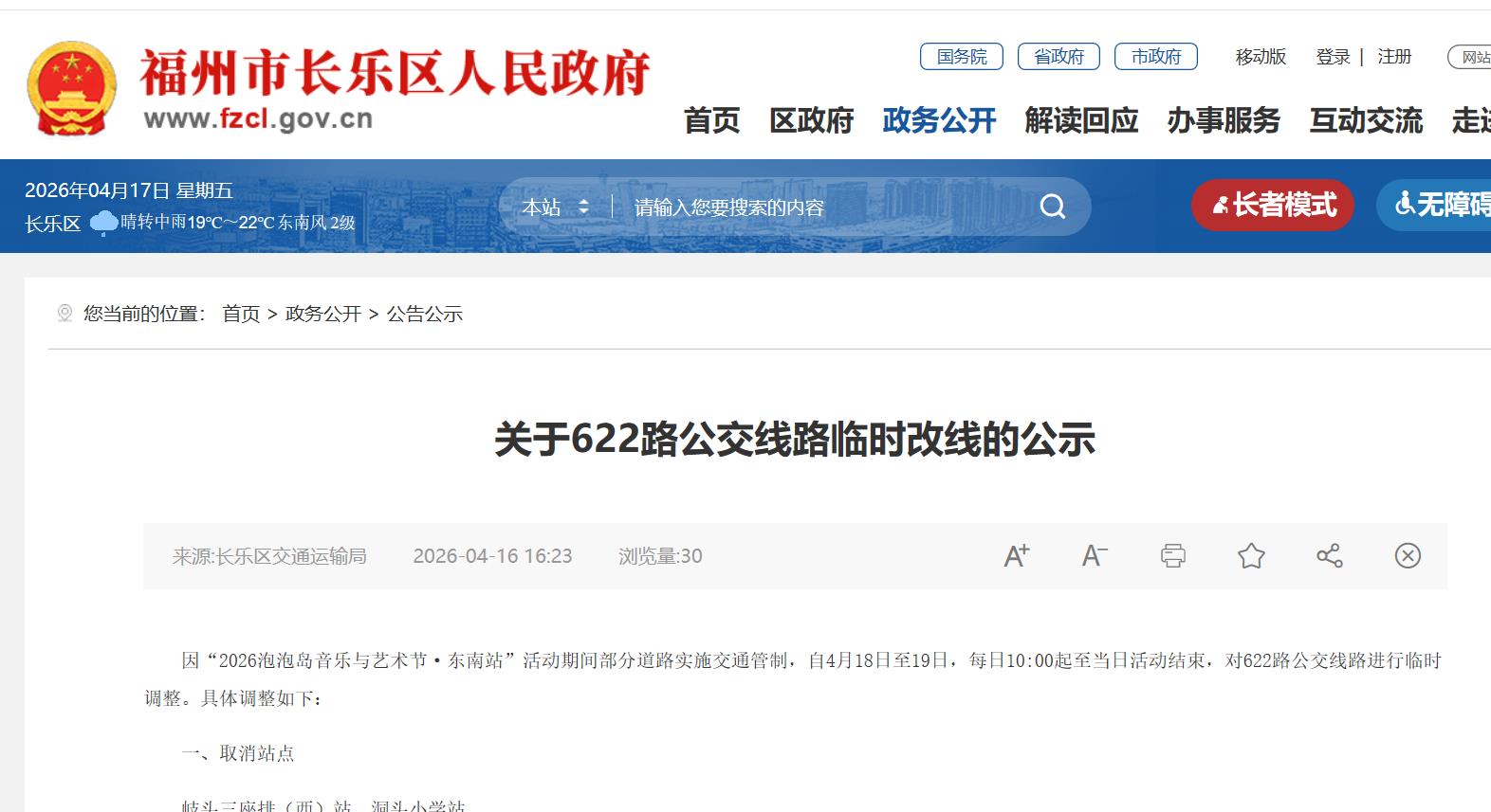 因“2026泡泡岛音乐与艺术节·东南站”活动期间部分道路实施交通管制,自4月18日至19日,每日10:00起至当日活动结束,对622路公交线路进行临时调整。具体调整如下: