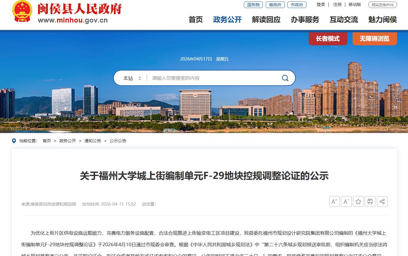 2026年4月15日,:闽侯县自然资源和规划局发布“关于福州大学城上街编制单元F-29地块控规调整论证的公示”。