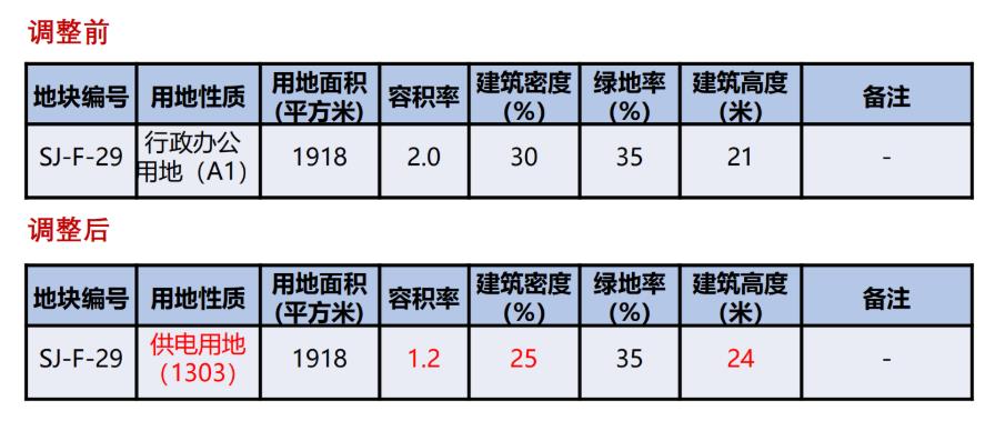地块编号 SJ-F-29,用地性质 为行政办公用地,用地面积1918平米,容积率2.0,建筑密度30%,绿地率35%,建筑高度21米。调整后,用地性质为供电用地,容积率为1.2,建筑密度25%,建筑高度提高至24米。