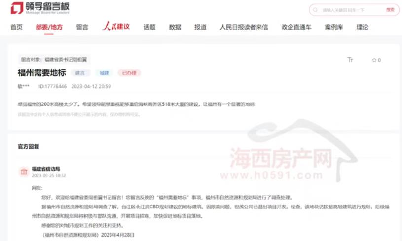 时间来到2023年5月,针对市民建议重启海峡商务区518米大厦建设,福州市自然资源和规划局表示,台江区北江滨CBD规划建设的地标建筑,因限高问题,世茂公司已退出项目开发。