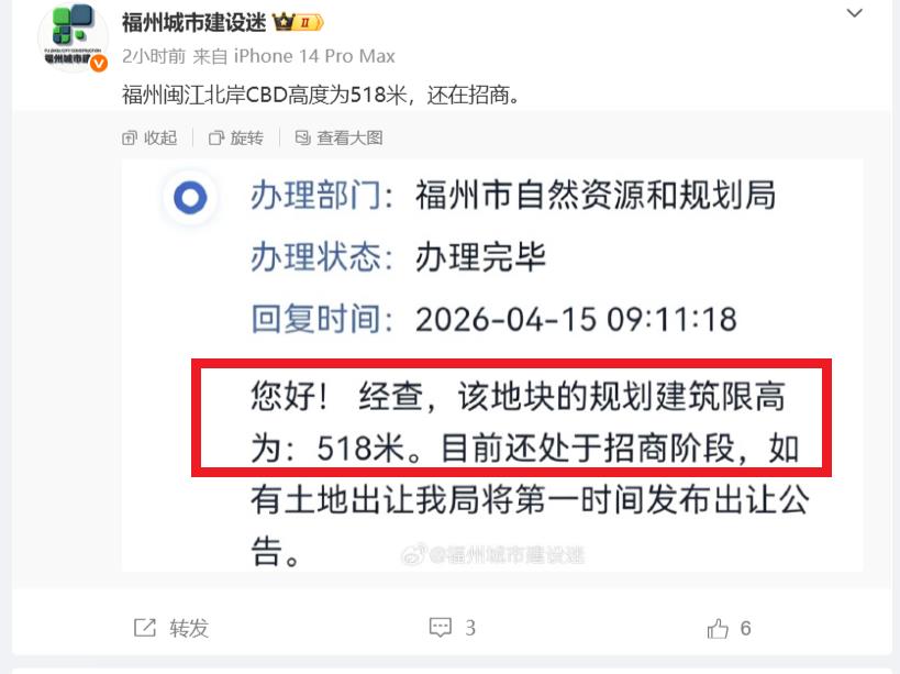 从图中可以看到,福州市自然资源和规划局于2026年4月15日,在回复市民关于闽江北CBD地块限高时称:经查,该地块的规划建筑限高为518米。目前还处于招商阶段,如有土地出让我局将第一时间发布出让公告。