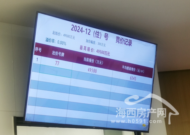 2024年3月30日,在福州市举行的首场土拍大会上,经过1轮竞价,77号竞买人福州海悦建设发展有限公司以底价4.95亿竞得福州宗地2024-12号,楼面地价6143元/㎡。