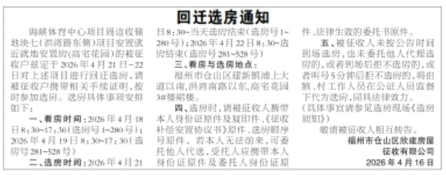 海西房产网(微信公众号:fjhxfcw)消息:2026年4月16日,福州市仓山区欣建房屋征收有限公司发布一则回迁选房通知。