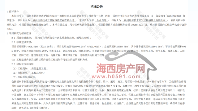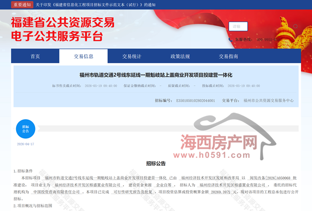 海西房产网(微信公众号:fjhxfcw)消息:4月17日,福建省公共资源交易电子公共服务平台发布“福州市轨道交通2号线东延线一期魁岐站上盖商业开发项目投建营一体化招标公告”。