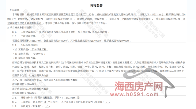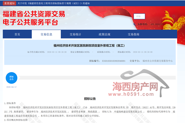 海西房产网(微信公众号:fjhxfcw)消息:4月17日,福建省公共资源交易电子公共服务平台发布“福州经济技术开发区医院新院项目室外景观工程(施工)招标公告”。