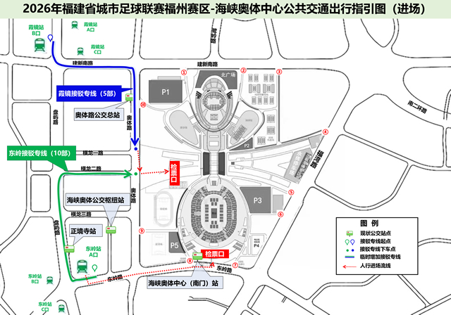 2.观众可由海峡奥体中心西广场离场,根据引导标识向南步行约700米至东岭地铁站A口,或向北步行约900米至霞镜地铁站C口。