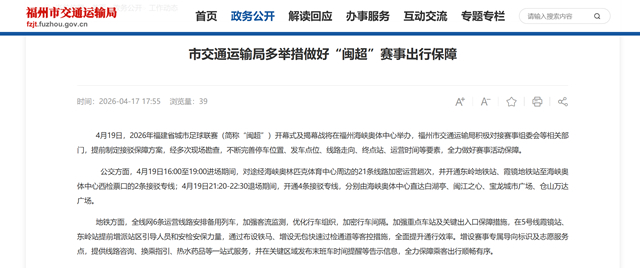 公交方面,4月19日16:00至19:00进场期间,对途经海峡奥林匹克体育中心周边的21条线路加密运营趟次,并开通东岭地铁站、霞镜地铁站至海峡奥体中心西检票口的2条接驳专线;4月19日21:20-22:30退场期间,开通4条接驳专线,分别由海峡奥体中心直达白湖亭、闽江之心、宝龙城市广场、仓山万达广场。