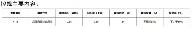 晋安区350111-LP-K管理单元K-13地块用地性质为居住商业综合用地,面积0.38公顷(5.7亩),容积率上限0.8,建筑限高24米,建筑密度不超过35%,绿地率不少于30%。