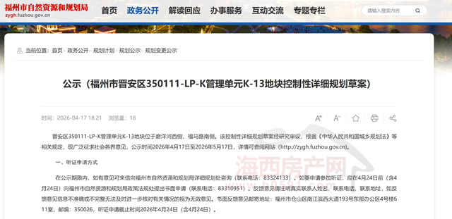 海西房产网(微信公众号:fjhxfcw)消息:4月17日,福州市自然资源和规划局发布“福州市晋安区350111-LP-K管理单元K-13地块控制性详细规划草案公示”。