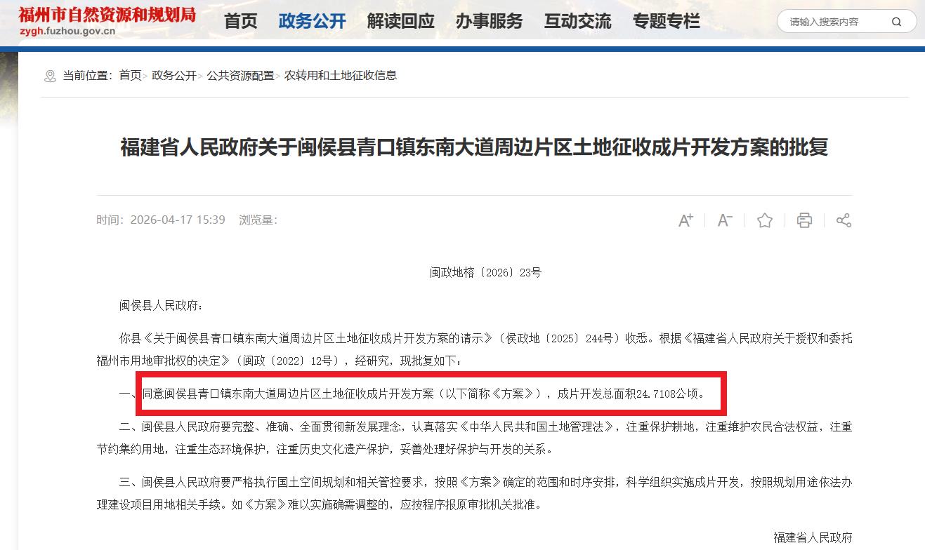 海西房产网(微信公众号:fjhxfcw)消息:2026年4月17日,福州市政府官网发布“福建省人民政府关于闽侯县青口镇东南大道周边片区土地征收成片开发方案的批复”。