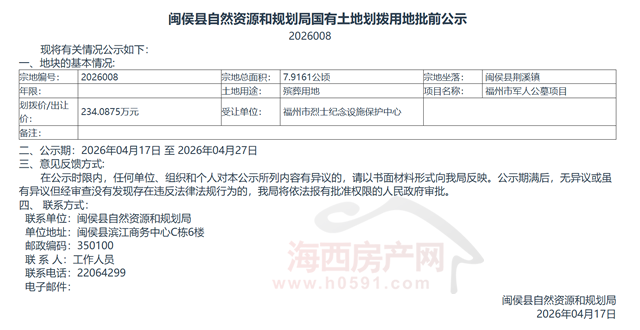 海西房产网(微信公众号:fjhxfcw)消息:4月17日,闽侯县自然资源和规划局发布一则国有土地划拨用地批前公示。