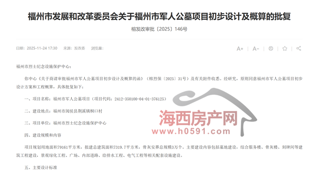 2025年11月24日,福州市发展和改革委员会发布“关于福州市军人公墓项目初步设计及概算的批复(榕发改审批〔2025〕146号)”。