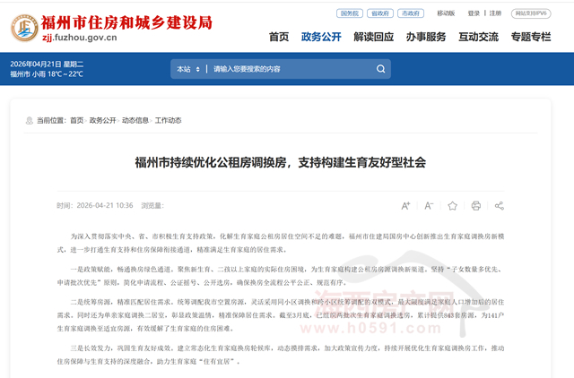 海西房产网(微信公众号:fjhxfcw)消息:为深入贯彻落实中央、省、市积极生育支持政策,化解生育家庭公租房居住空间不足的难题,福州市住建局国房中心创新推出生育家庭调换房新模式,进一步打通生育支持和住房保障衔接通道,精准满足生育家庭的居住需求。