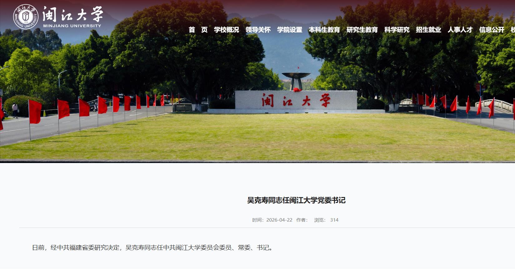 海西房产网(微信公众号:fjhxfcw)消息:据闽江学院官网4月22日发布的消息显示,日前,经中共福建省委研究决定,吴克寿同志任中共闽江大学委员会委员、常委、书记。