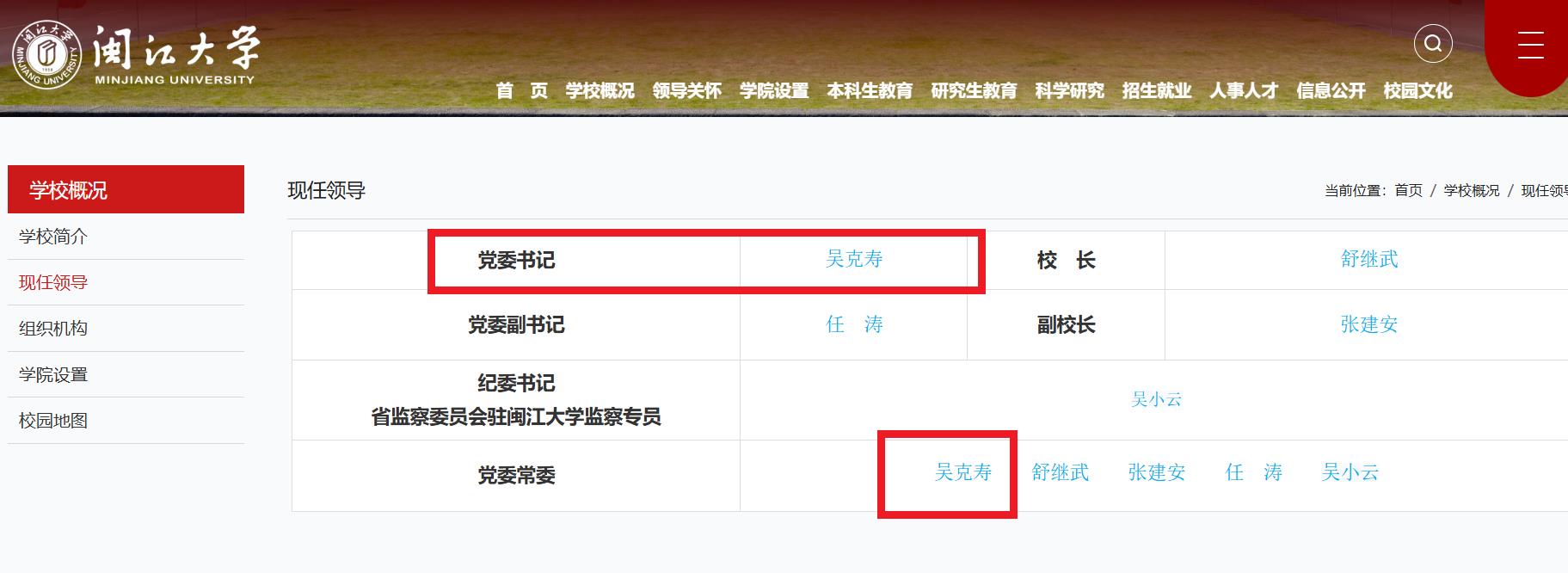 在该校的现任领导中,也已明确标注为吴克寿为党委书记、党委常委。