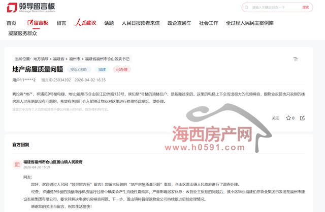 海西房产网(微信公众号:fjhxfcw)消息:近日,有业主通过人民网领导领导留言板投诉: