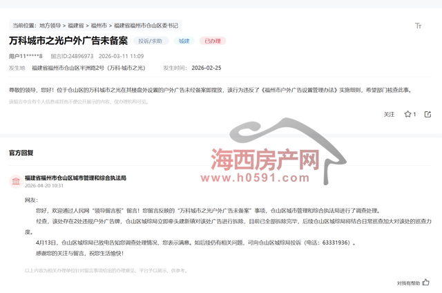该投诉于4月20日得到福州市仓山区城市管理和综合执法局回复: