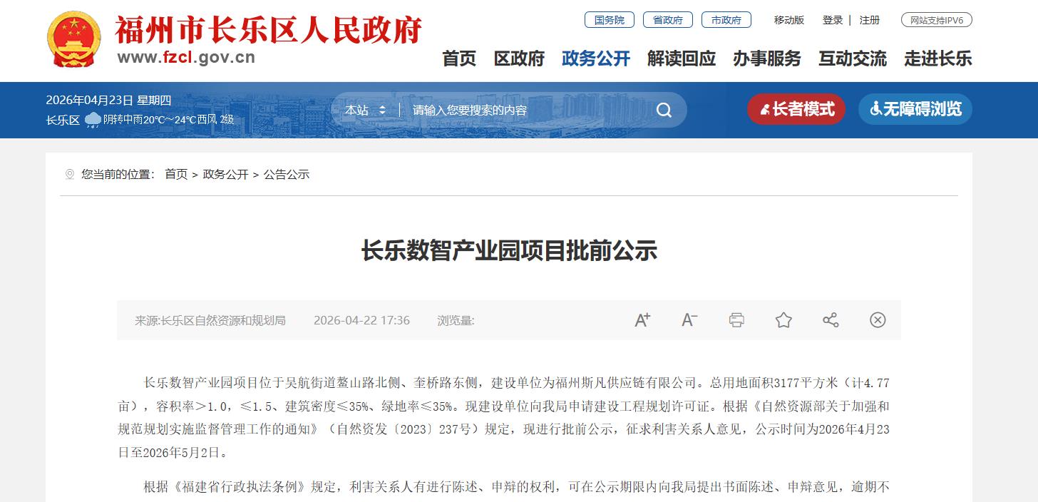 海西房产网(微信公众号:fjhxfcw)消息:2026年4月22日,长乐区自然资源和规划局发布“长乐数智产业园项目批前公示"。