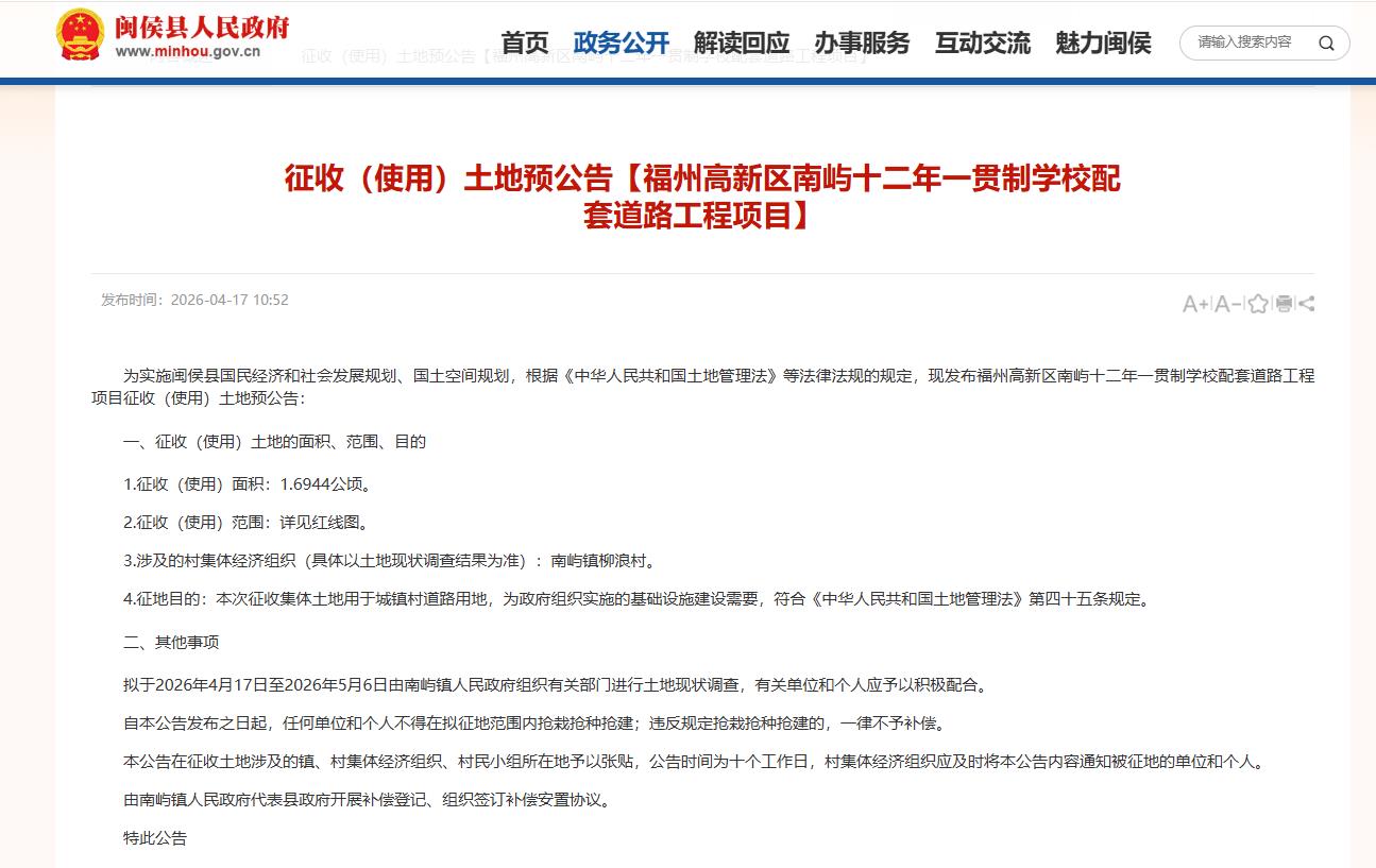 海西房产网(微信公众号:fjhxfcw)消息:2026年4月17日,闽侯县人民政府发布“征收(使用)土地预公告【福州高新区南屿十二年一贯制学校配套道路工程项目】”。