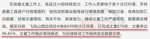 另据“遇见建新”4月22日发文透露,截至目前,飞凤山周边项目A地块698栋涉迁房屋,已完成丈量676栋,丈量率达96.85%,丈量工作稳步高效推进,为后续各项工作提供坚实数据支撑。