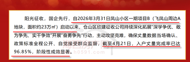 据悉,凤山小区一期项目B(飞凤山周边A地块,面积约23万㎡)2026年3月31日启动,截至4月21日,入户丈量完成率已达96.85%,阶段性成效显著。
