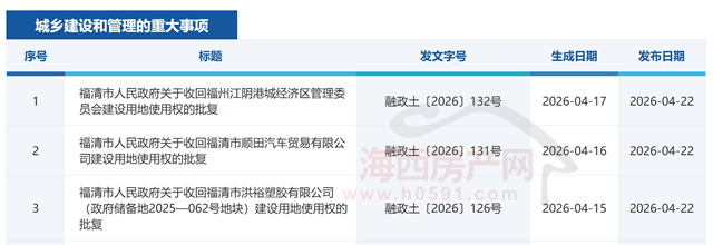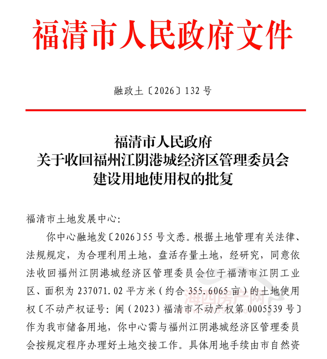 4月22日,福清市人民政府发布“关于收回福州江阴港城经济区管理委员会建设用地使用权的批复(融政土〔2026〕132号)”。