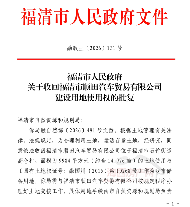 4月22日,福清市人民政府发布“关于收回福清市顺田汽车贸易有限公司建设用地使用权的批复(融政土〔2026〕131号)”。