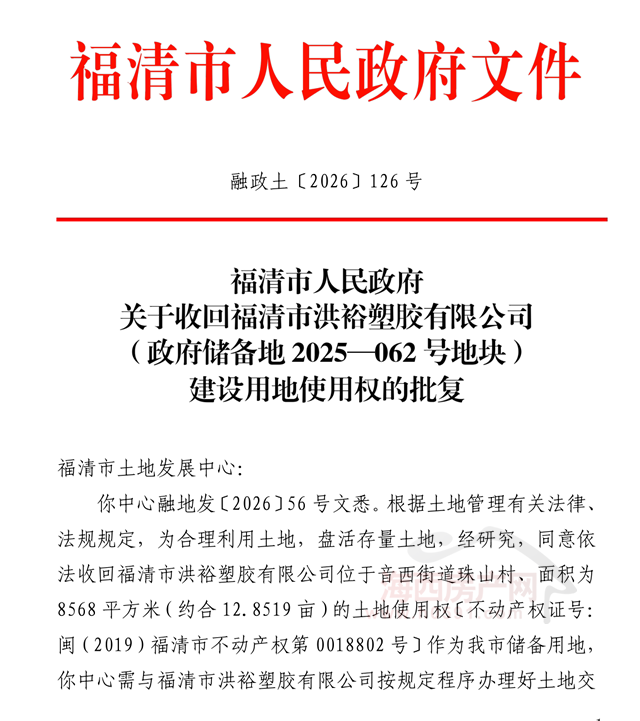 4月22日,福清市人民政府发布“关于收回福清市洪裕塑胶有限公司(政府储备地2025—062号地块)建设用地使用权的批复(融政土〔2026〕126号)”。