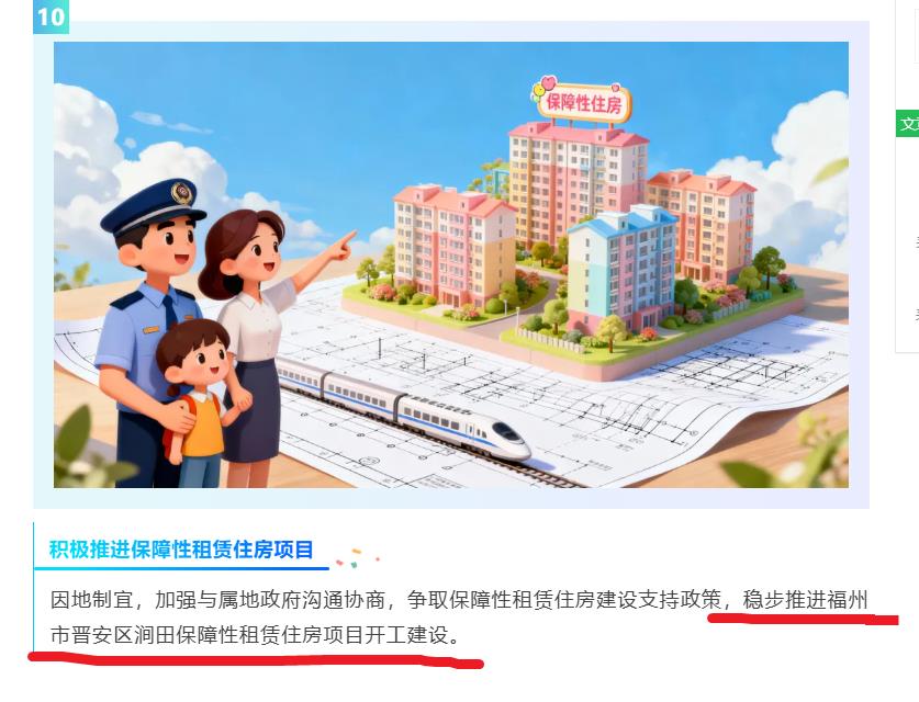 “魅力南铁”公众号发布2026年集团要办的“十件实事”,明确提到积极推进保障性租赁住房项目。因地制宜,加强与属地政府沟通协商,争取保障性租赁住房建设支持政策,稳步推进福州市晋安区涧田保障性租赁住房项目开工建设。