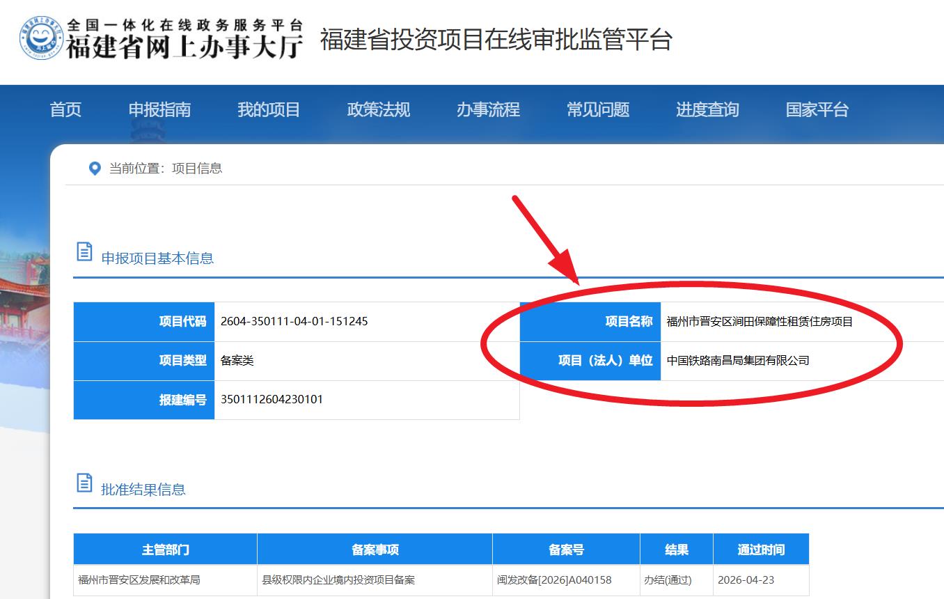 海西房产网(微信公众号:fjhxfcw)消息:福建省投资项目在线审批监管平台发布信息显示,“福州市晋安区涧田保障性租赁住房项目”已于2026年4月23日取得县级权限内企业境内投资项目备案,批准结果信息为办结(通过)。