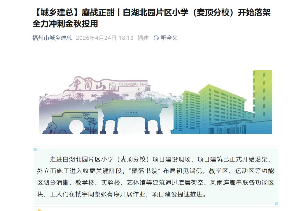 海西房产网(微信公众号:fjhxfcw)消息:据“福州市城乡建总”4月24日发文透露,白湖北园片区小学(麦顶分校)开始落架 ,力冲刺金秋投用。