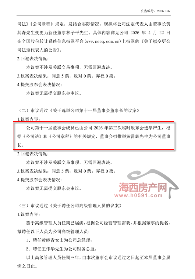 公告称,公司董事长黄其森自2026年4月22日起不再担任董事长。