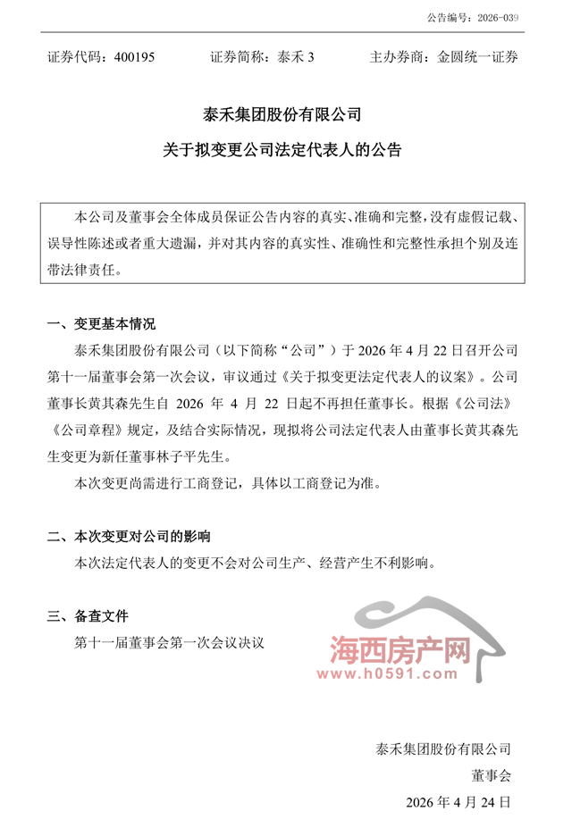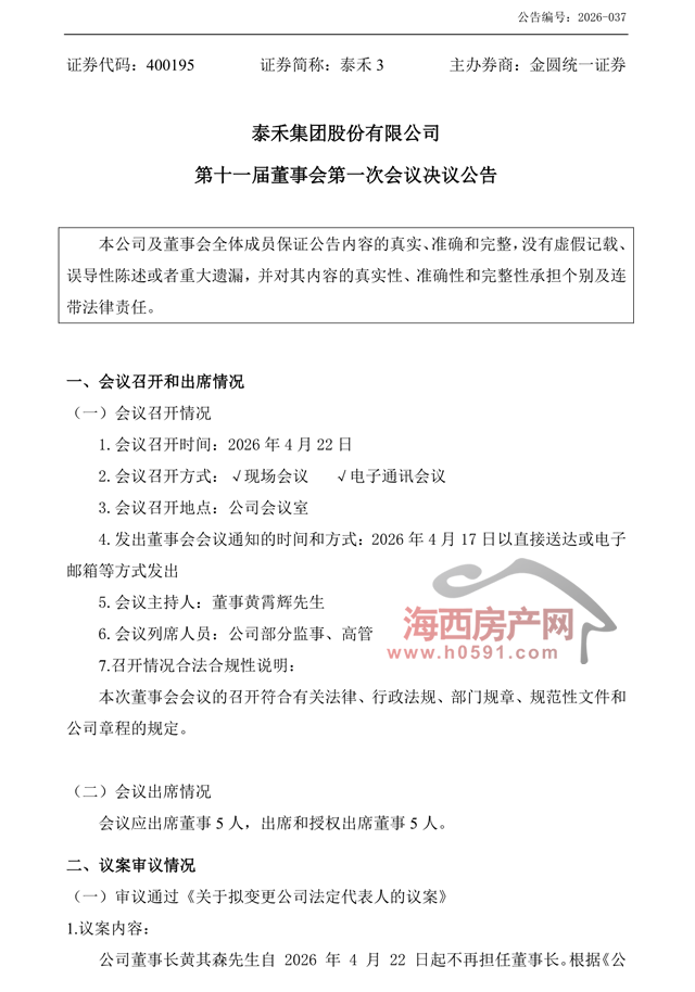 海西房产网(微信公众号:fjhxfcw)消息:4月24日晚间,泰禾集团发布“第十一届董事会第一次会议公告”。