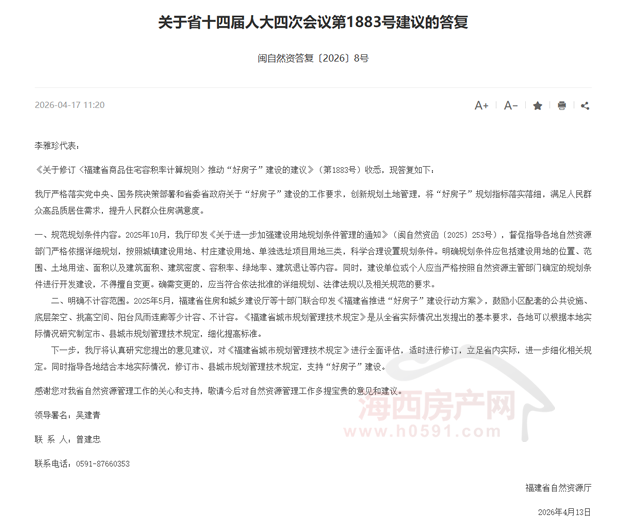 海西房产网(微信公众号:fjhxfcw)消息:近日,福建省自然资源厅发布“关于省十四届人大四次会议第1883号建议的答复(闽自然资答复〔2026〕8号)”。