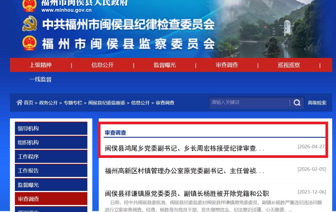 2026年4月27日,中共福州市闽侯县纪律检查委员会、福州市闽侯县监察委员会网站发布一则审查调查,闽侯县鸿尾乡党委副书记、乡长周宏栋接受纪律审查和监察调查。